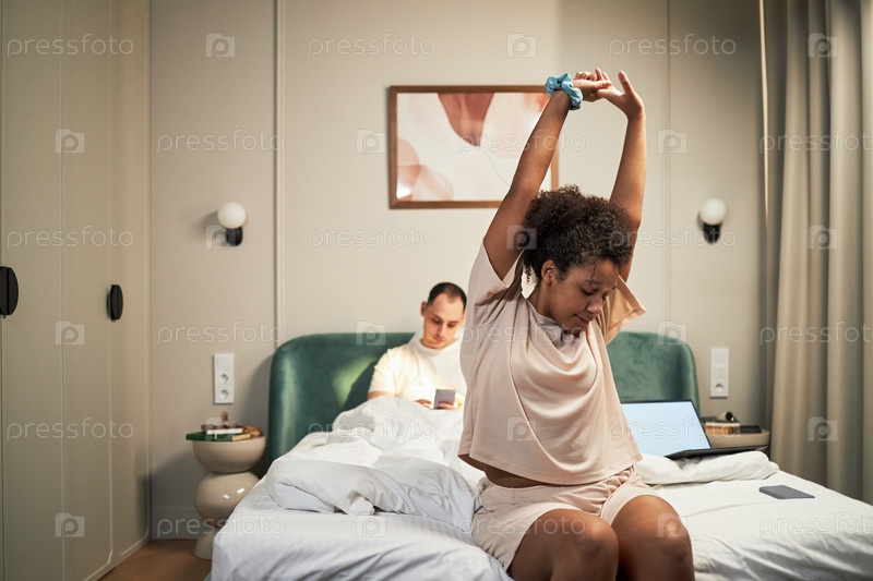 Молодая взрослая чернокожая женщина растягивается, пока белый мужчина использует смартфон