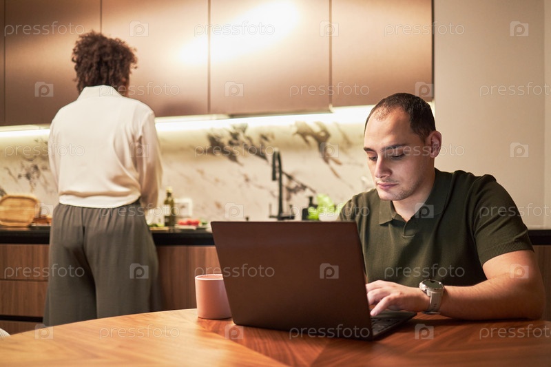 Молодой белый мужчина использует ноутбук, в то время как чернокожая женщина готовит еду на кухне