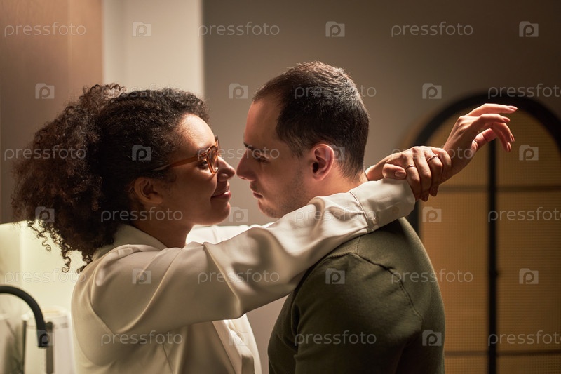Молодая мультиэтническая пара с любовью обнимается на современной домашней кухне