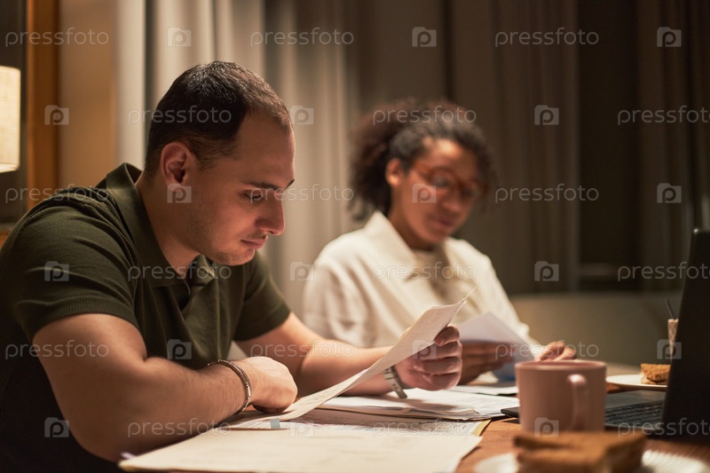 Молодой белый мужчина и молодая чернокожая женщина вместе просматривают финансовые документы