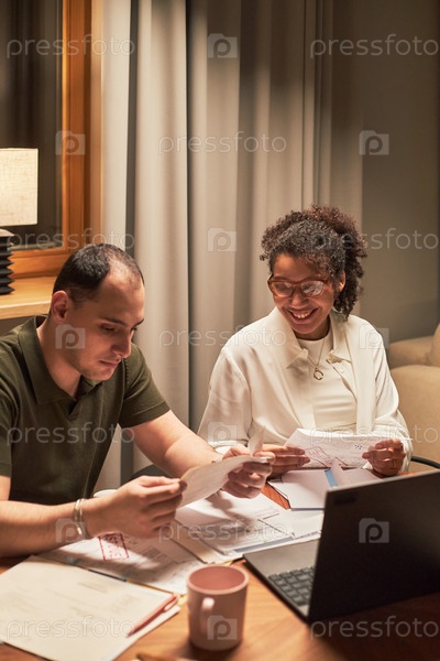 Юный кавказский мужчина и чернокожая женщина анализируют бумаги вместе за рабочим столом