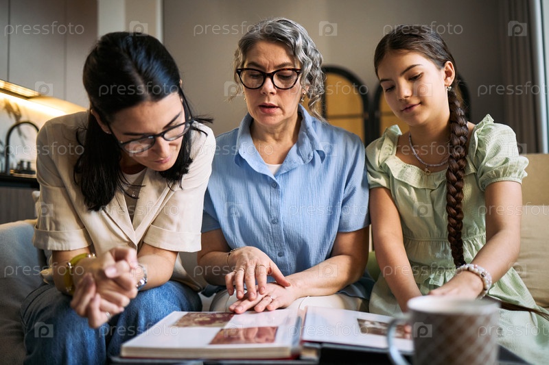 Семейные женщины трех поколений делятся воспоминаниями о фотоальбоме