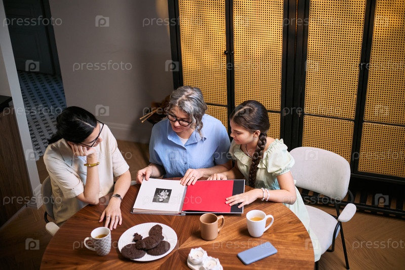 Старшая женщина показывает семейный фотоальбом взрослой женщине и подростку