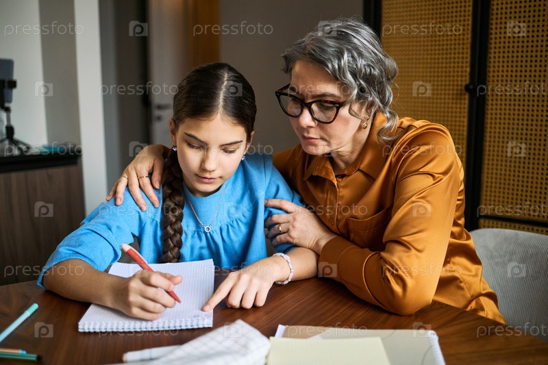 Девушка-подросток учится с женщиной среднего возраста, поддерживающей домашнее задание