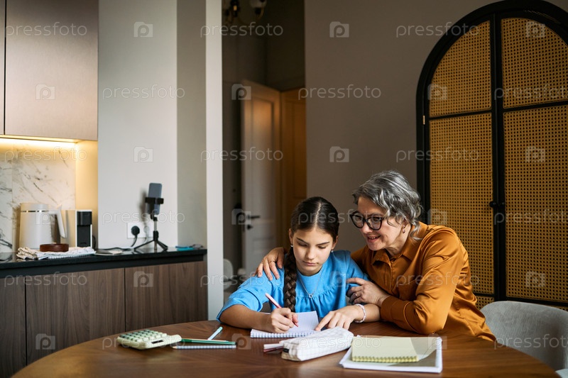 Женщина-старший тренер Школьница пишет во время домашнего обучения