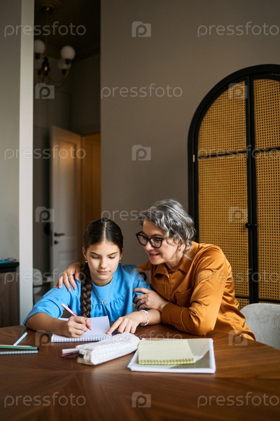 Женщина среднего возраста помогает девочке-подростку с домашними заданиями дома