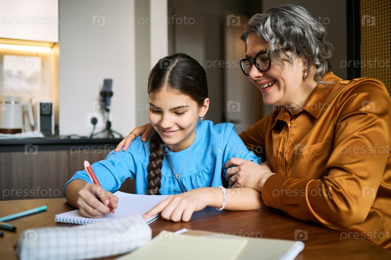 Женщина среднего возраста помогает школьнице учиться дома