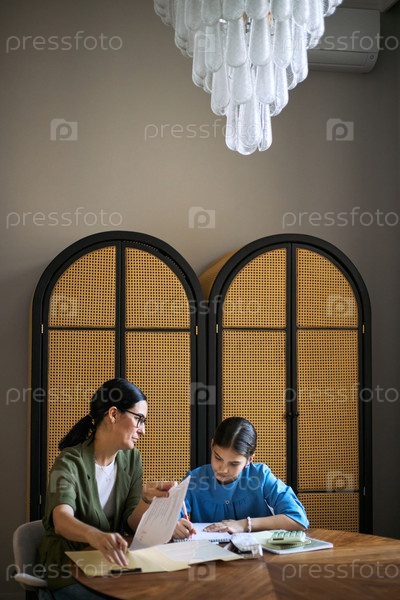Взрослая женщина помогает девочке-подростку с домашними заданиями дома
