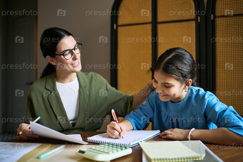 Взрослая женщина помогает девочке-подростку учиться на школьные экзамены