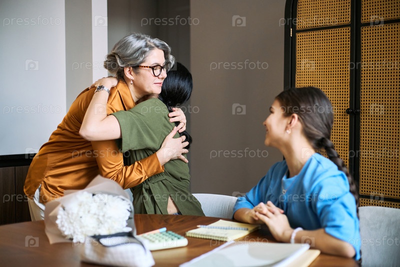 Женщина среднего возраста обнимает коллегу во время работы Прощай