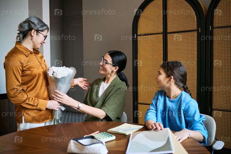 Пожилые женщины представляют цветы дочери в День матери