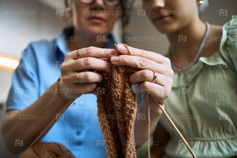 Женщина среднего возраста, направляющая девочку-подростка в обучении вязанию