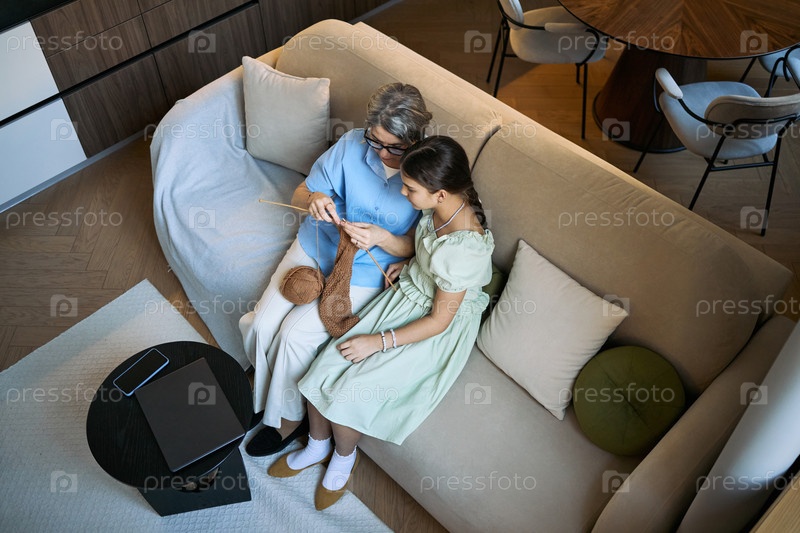Старшая женщина учит девочку вязанию дома для укрепления семейных связей