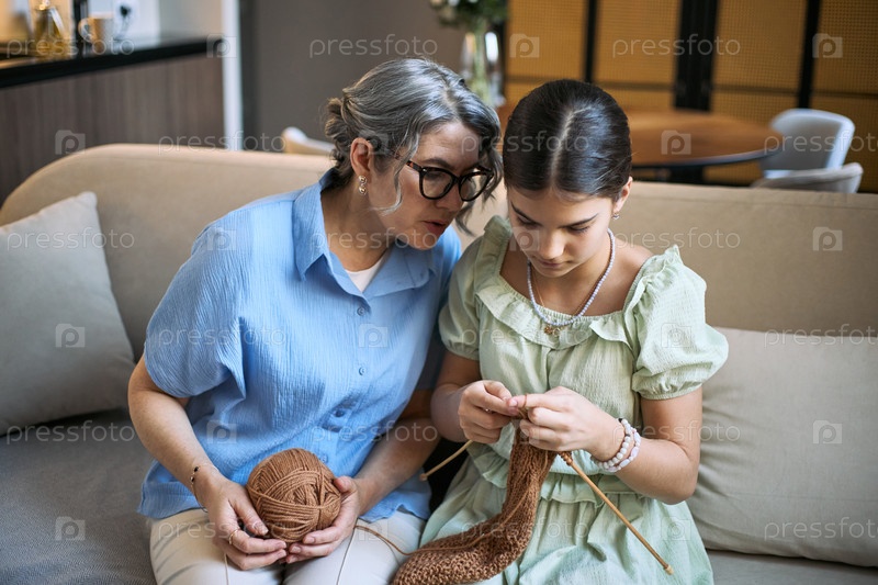Старшая женщина обучает девочку вязанию для развития творческих навыков