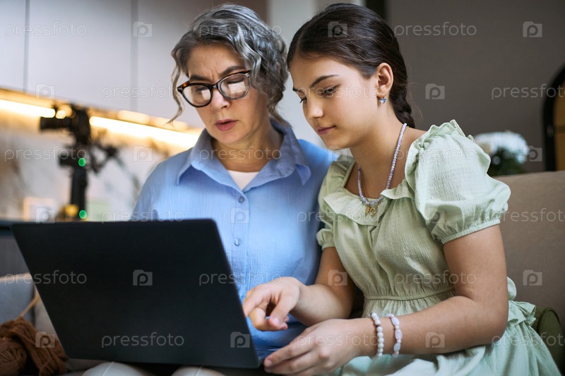 Женщина средних лет помогает девочке-подростку учиться на ноутбуке