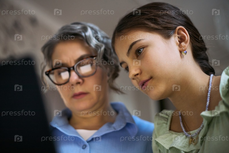Женщина средних лет и девочка-подросток изучают компьютерный экран