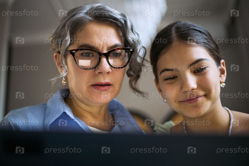 Женщина среднего возраста и девочка-подросток смотрят на ноутбук вместе