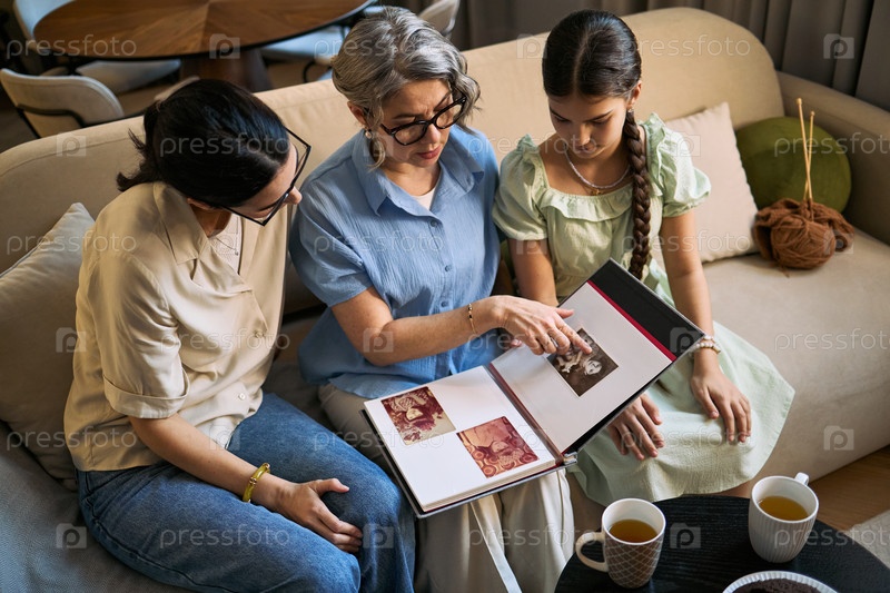 Старшая женщина делится семейными воспоминаниями со взрослой женщиной и подростком