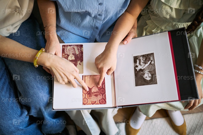 Члены семьи просматривают фотоальбом и делятся воспоминаниями дома