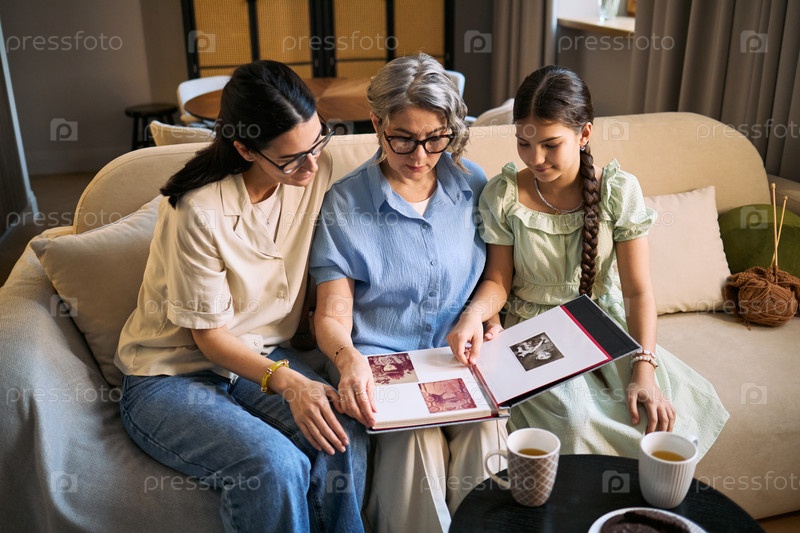 Старшая женщина с взрослой дочерью и подростком, просматривающая семейный альбом