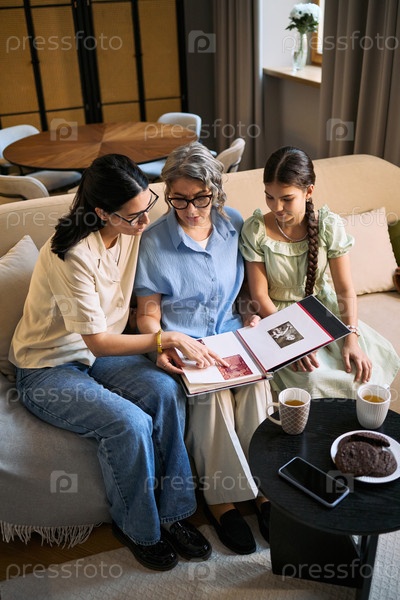 Взрослая женщина и старшая мать просматривают семейный фотоальбом