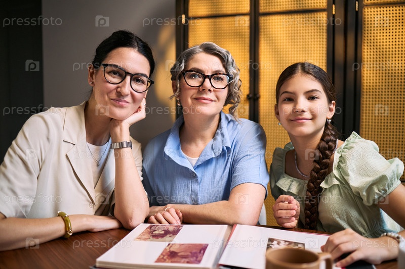Портрет трех поколений семейных женщин, просматривающих фотоальбом