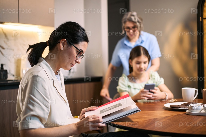 Взрослая женщина читает, в то время как семья использует смартфон дома
