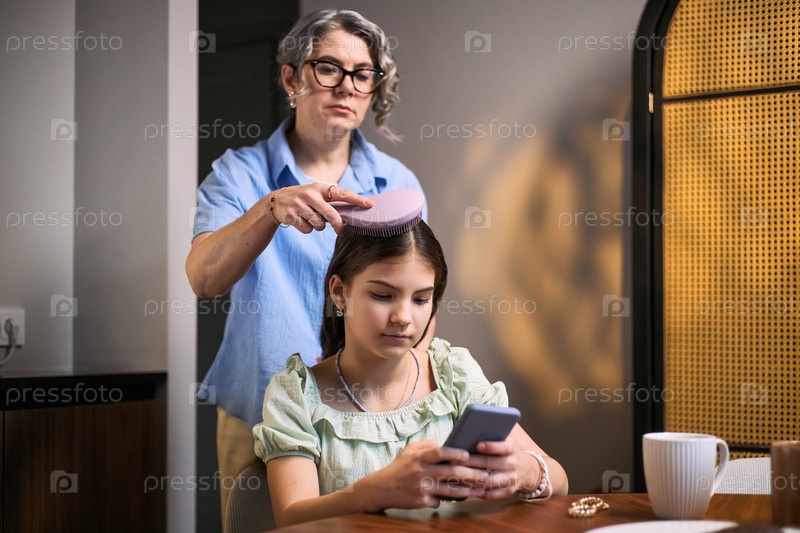 Женщина среднего возраста чистит волосы девочки-подростка во время экрана