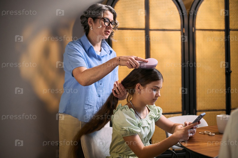 Женщина среднего возраста ухаживает за девочкой-подростком во время мобильного использования