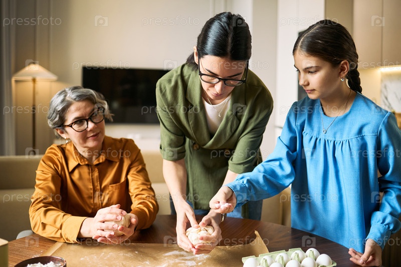Женщина среднего возраста учит девочку-подростка выпечке в домашних условиях