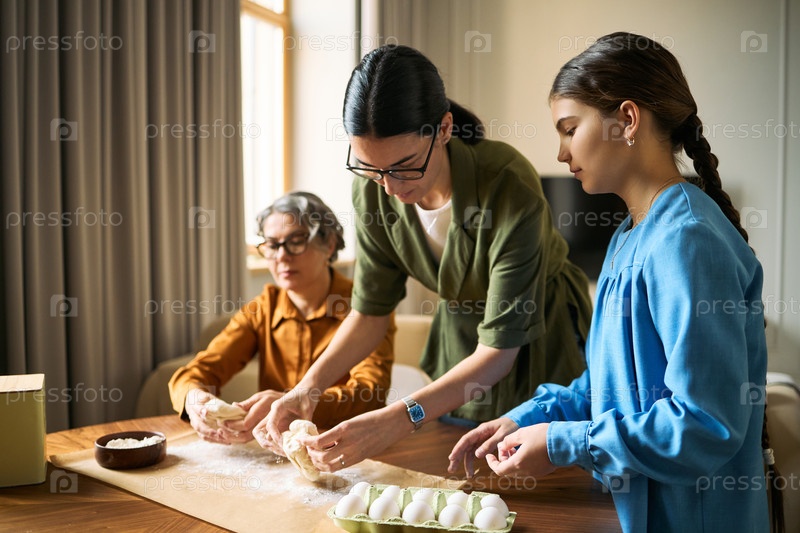 Пожилая женщина и взрослые женщины, готовящие тесто для семейной выпечки