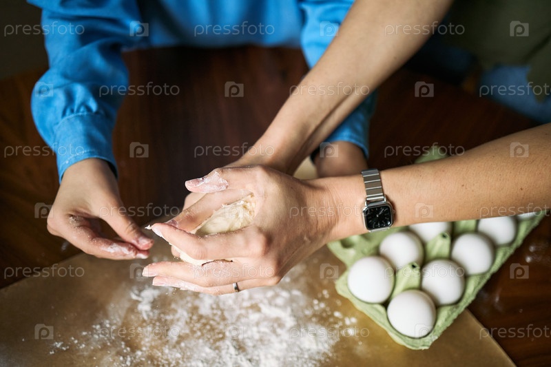 Взрослая женщина и ребенок плетут тесто для семейной выпечки