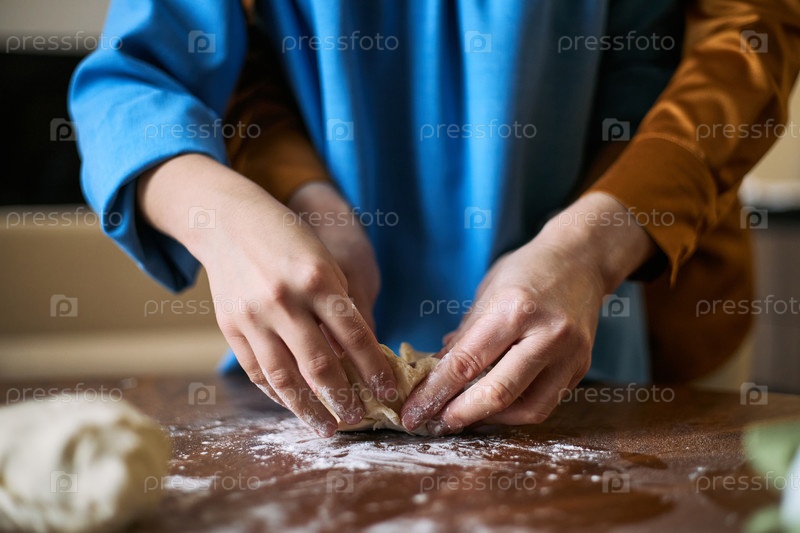 Взрослая женщина и ребенок плетут тесто для домашней кулинарной деятельности