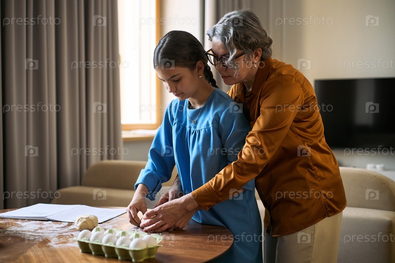 Старшая женщина направляет подростковую девушку, которая дома выпекает тесто