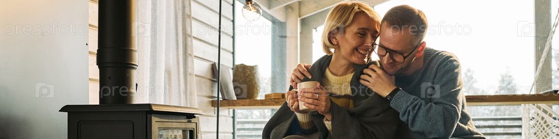 Кавказская пара средних лет отдыхает вместе в помещении возле дровяной печи