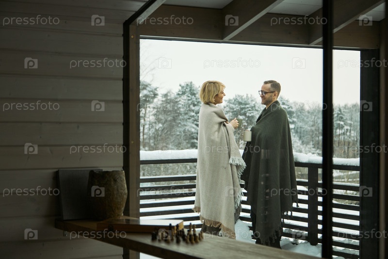 Кавказская пара средних лет наслаждается горячими напитками вместе на зимнем балконе