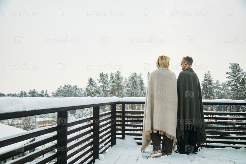 Кавказская взрослая пара стоит на балконе с видом на снежный лес