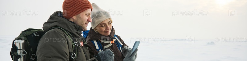 Кавказская пара средних лет использует смартфон во время прогулки по снежному ландшафту