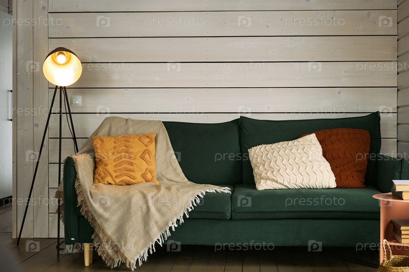 Современный интерьер гостиной с зеленым диваном и декоративными подушками