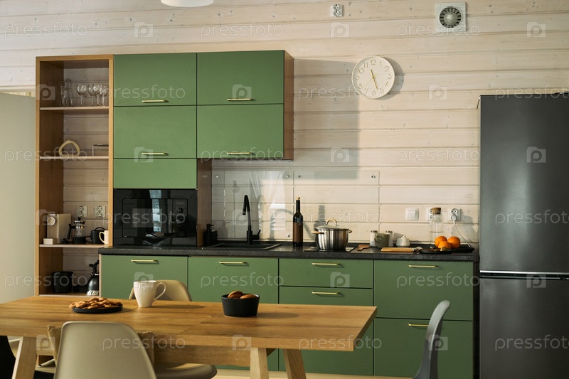 Кухонный интерьер с современными зелеными шкафами и деревянным обеденным столом