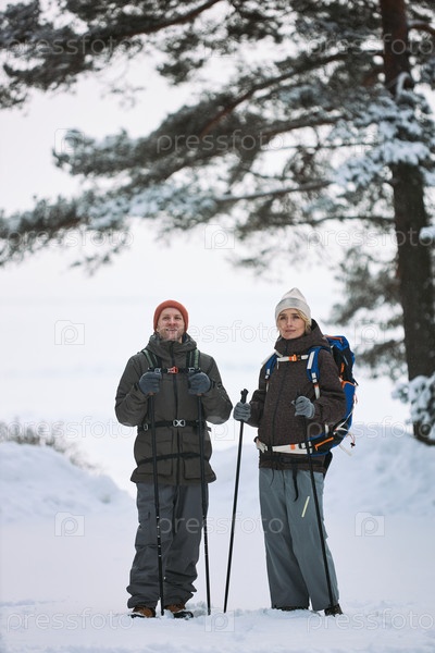 Кавказский мужчина и женщина путешествуют с поляками в снежном зимнем лесу