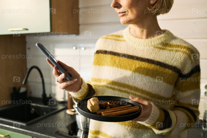 Кавказская женщина среднего возраста, использующая смартфон в то время как держит тарелку со закусками