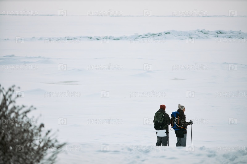 Два взрослых кавказских человека вместе ходят в поход через снежный зимний пейзаж