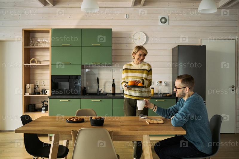 Кавказская молодая женщина подает мужчине на кухне завтрак