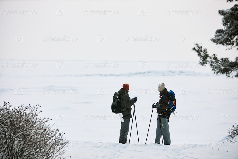 Два человека ходят в поход с трекинговыми полянами на снежном зимнем ландшафте