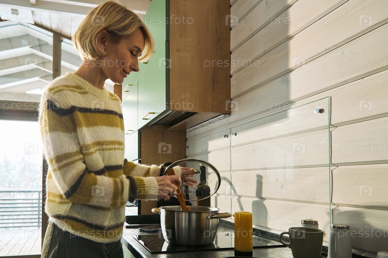 Кавказская женщина среднего возраста готовит пищу на современной кухне утром
