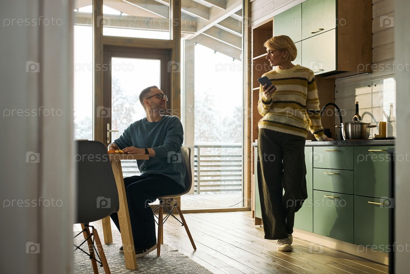 Кавказский мужчина средних лет улыбается кавказской женщине среднего возраста, использующей смартфон