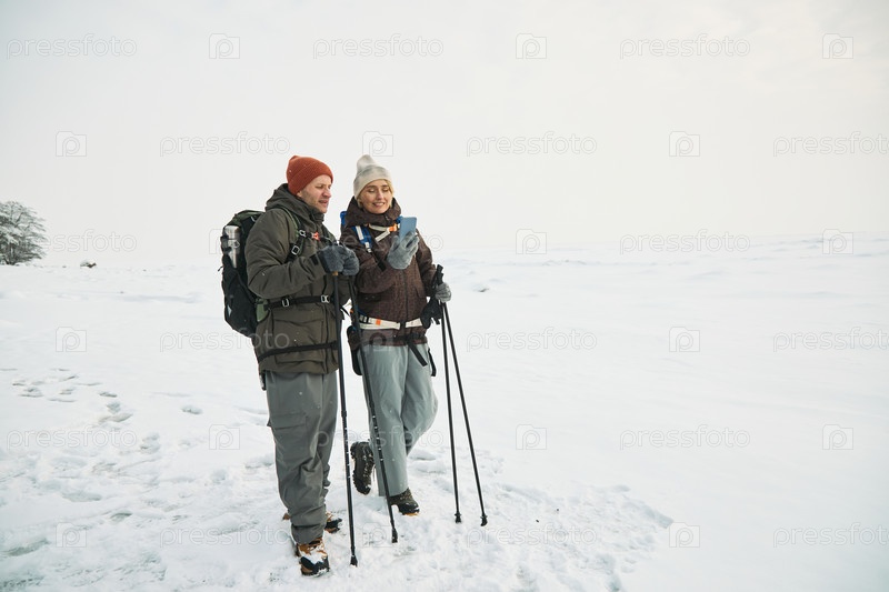 Взрослая белая пара вместе ходит в поход через снежный зимний пейзаж