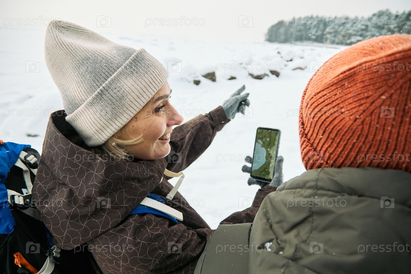 Взрослая кавказская женщина показывает навигацию со смартфонами во время похода на снегу