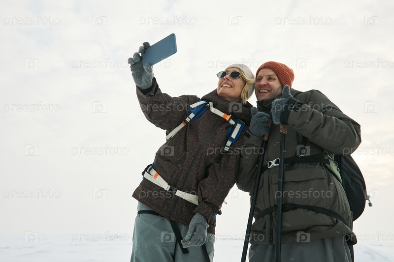 Кавказская пара делает селфи на открытом воздухе во время зимнего приключения